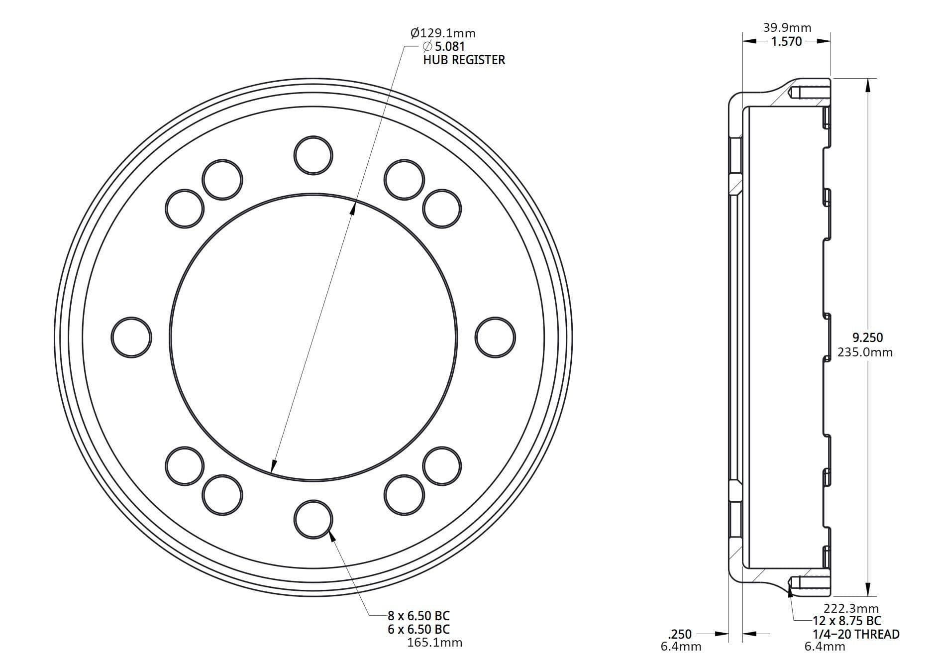 Please note this brake hat is designed specifically for Wilwood GT 36 Straight Vane Rotors and Ultimate Unit Bearings with 8 or 6 lug 6½" (165.1mm) bolt circle (BC) patterns.